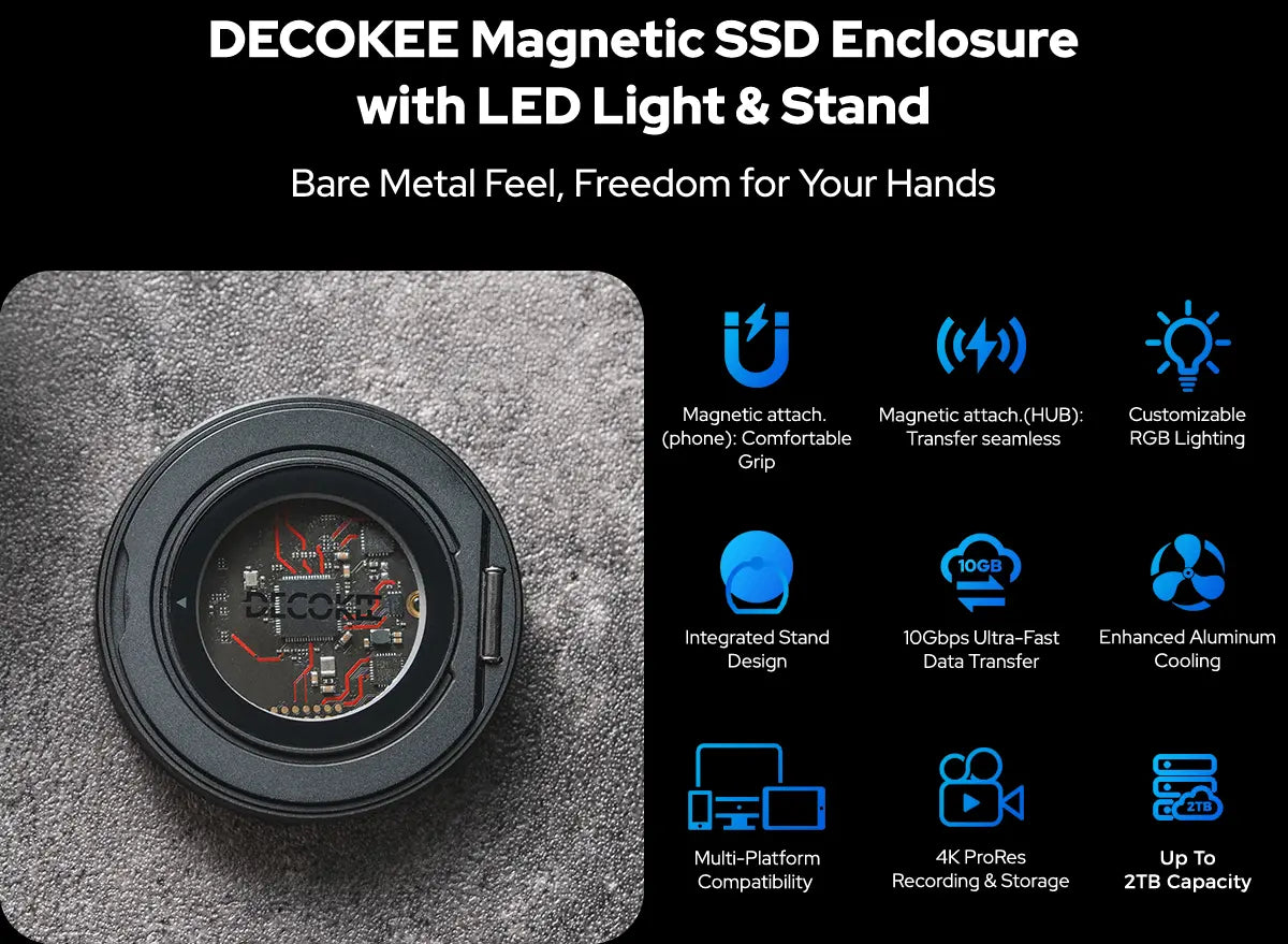 The DK-DISK2 magnetic SSD enclosure innovatively combines expandable storage with a phone stand. Its signature rear ring mechanism offers multi-angle adjustability, securely propping smartphones in portrait or landscape for hands-free video conferences and media streaming. More versatile than any SSD enclosure.