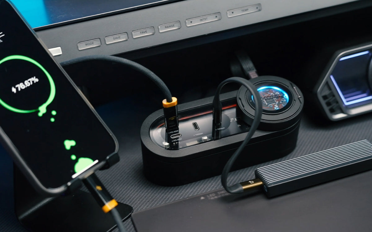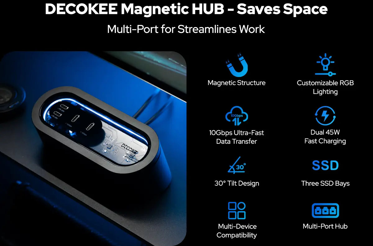 Sleek design with multi-port versatility. Simultaneously connect 4+ devices for high-speed transfers and 45W smart charging. Features transparent tech panels and dynamic RGB lighting. The rear-mounted Type-A port ensures dedicated disk transfer and clutter-free aesthetics.